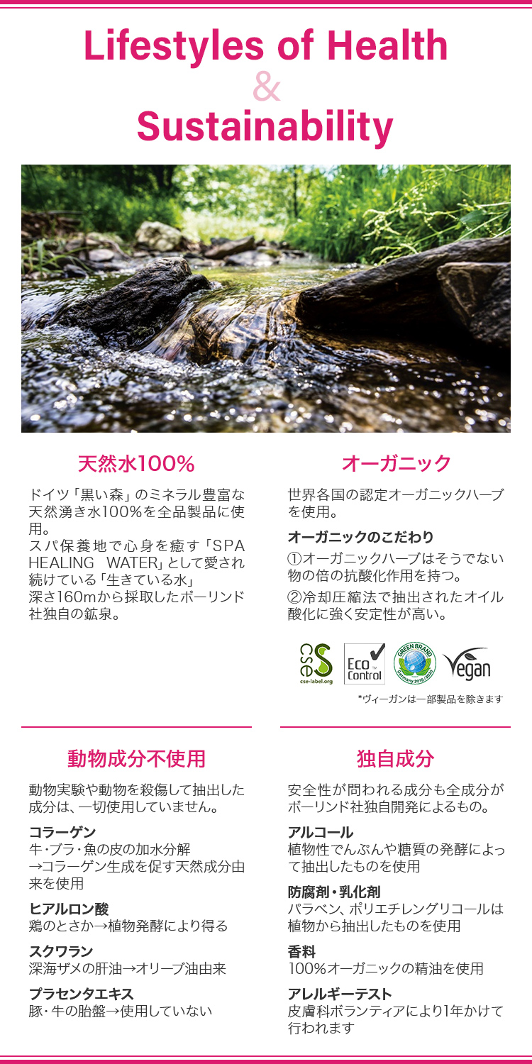 アンネマリー ボーリンドはオーガニック先進国ドイツで1959年創立。設立から60年以上にわたり世界60か国以上で愛されるオーガニックコスメのリーディングカンパニーです。創業以来貫き通している「食べられない化粧品はつくらない」という理念の下で作られた認証オーガニックコスメは、安全性の高さはもちろんのこと機能性の高さでも世界中の数々の賞を受賞しています。