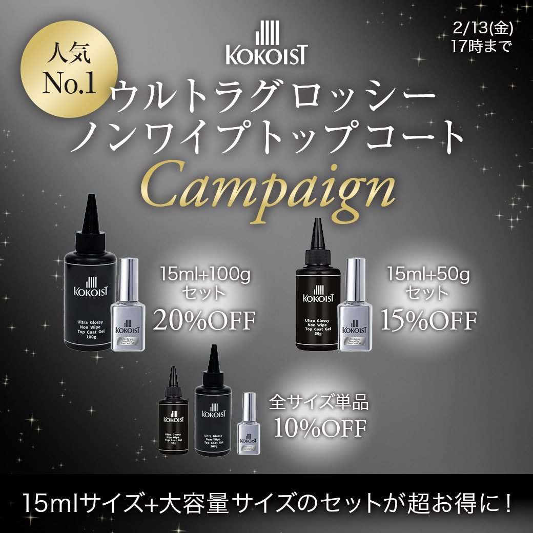 【KOKOIST】大人気!ウルトラグロッシーノンワイプトップコート 15mlサイズと大容量サイズのセットが最大20%OFF!単品10%OFF!2/13(金)17時まで