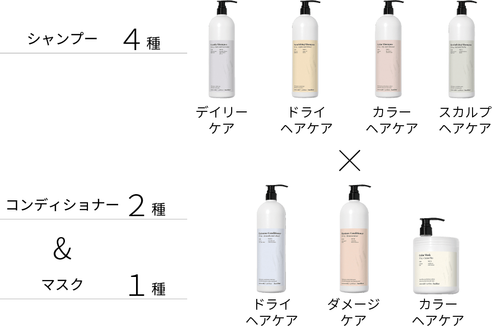 様々な髪質や頭皮のお悩みに合わせてシャンプーとコンディショナー&マスクを組み合わせ、