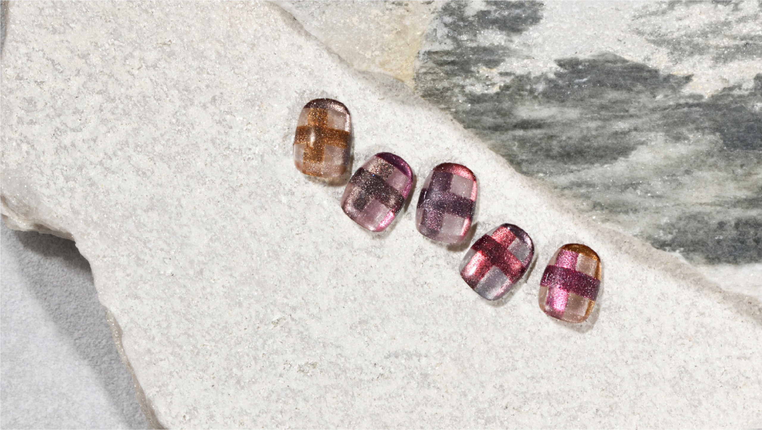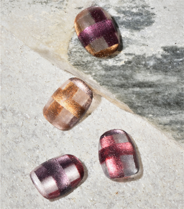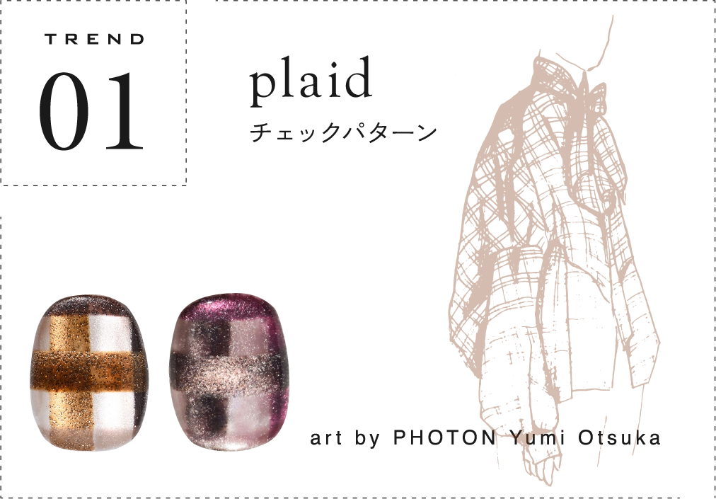 秋の定番チェック柄が、今年のコレクションではシアーやレザーとの素材MIXや大胆なプリントで展開されたりとフレッシュに進化。ネイルでもクラシックさを払拭する質感ジェルとの掛け合わせなど、新しいアプローチのチェックアートがトレンドです。