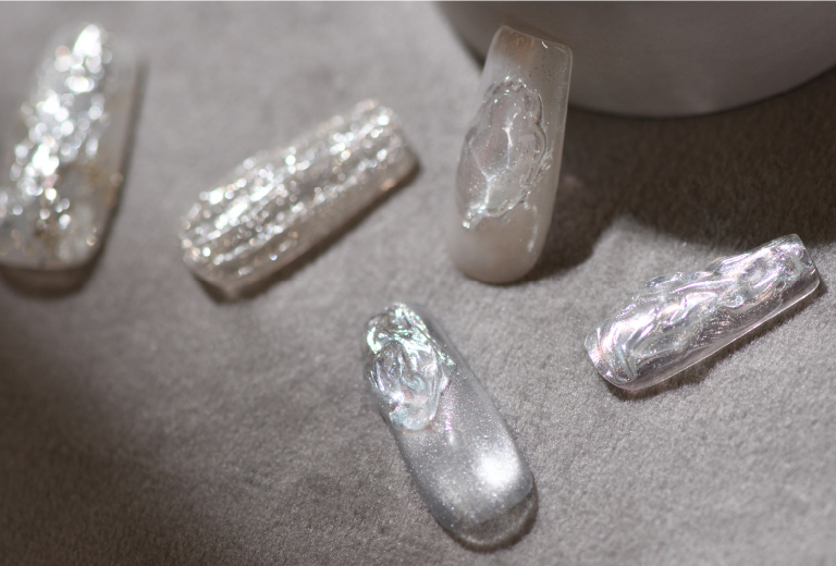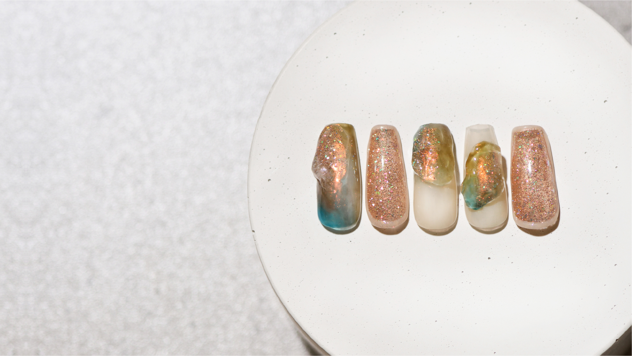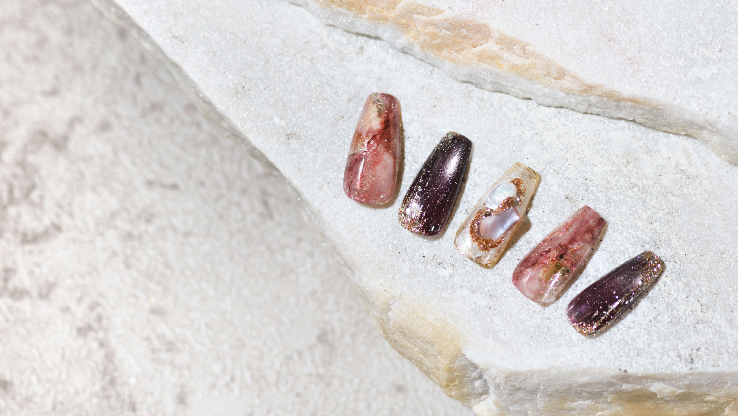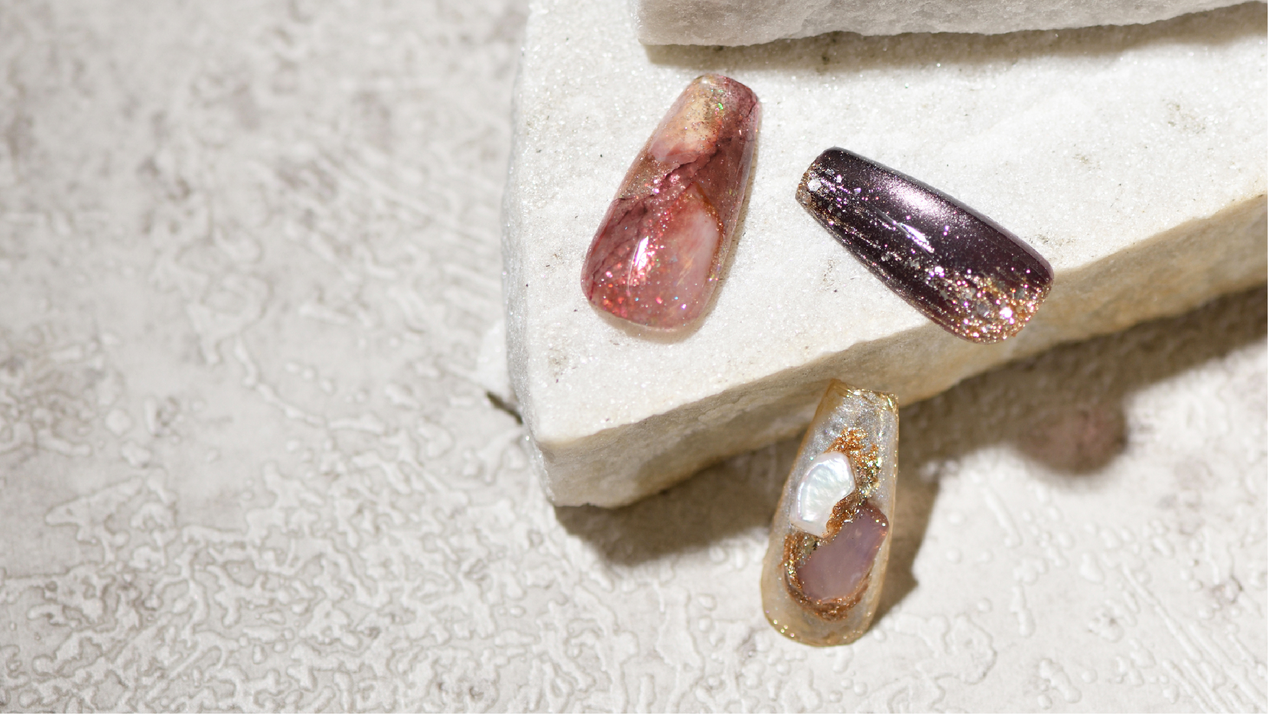自然が作り上げた美しい鉱物を彷彿とさせる「鉱物ニュアンス」は、創造的なデザインを楽しめる人気モチーフ。ニュアンスを重ねた立体感のあるアートは、アクセサリーを纏うように爪先に上品な彩りを与えてくれます。