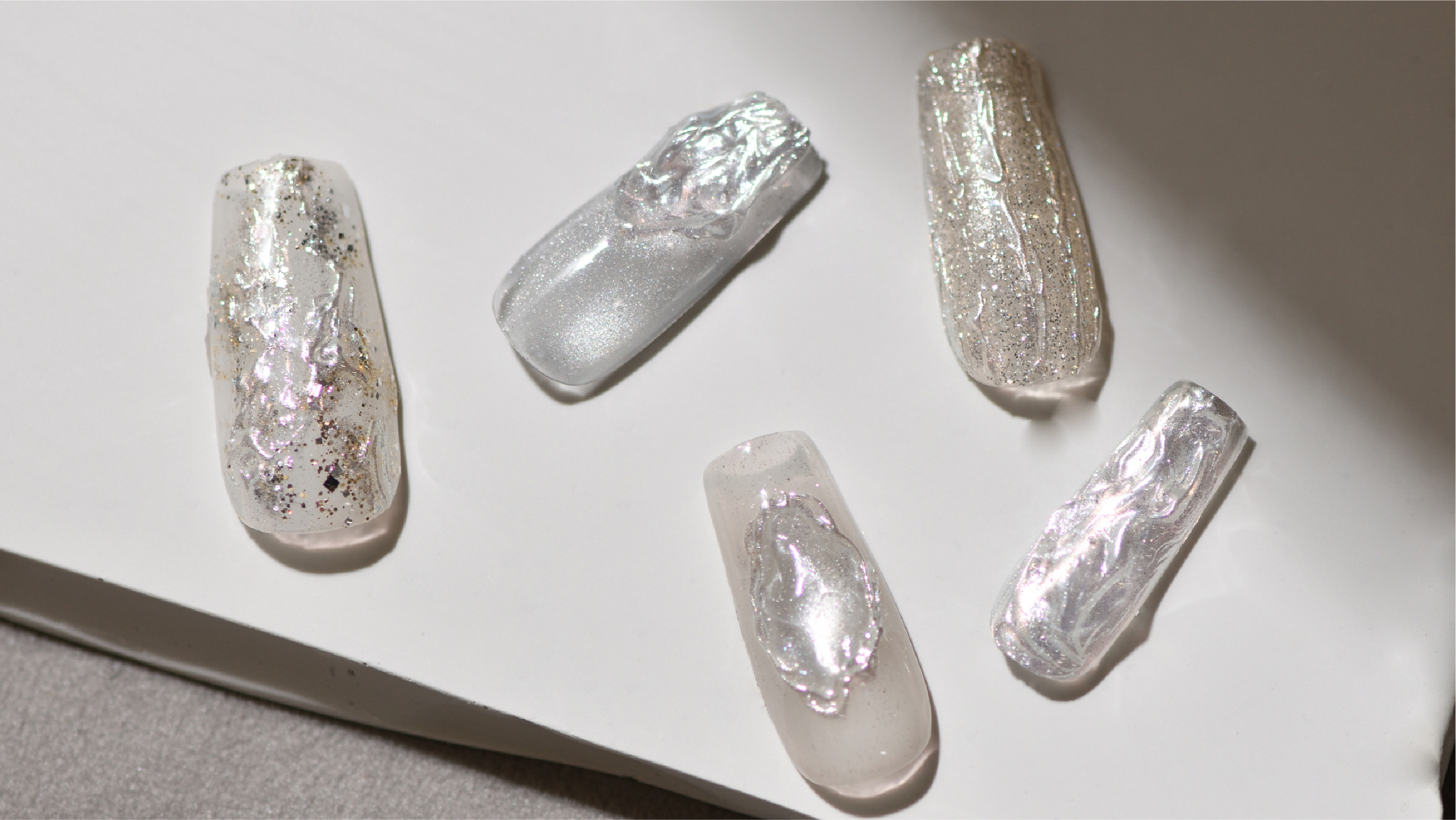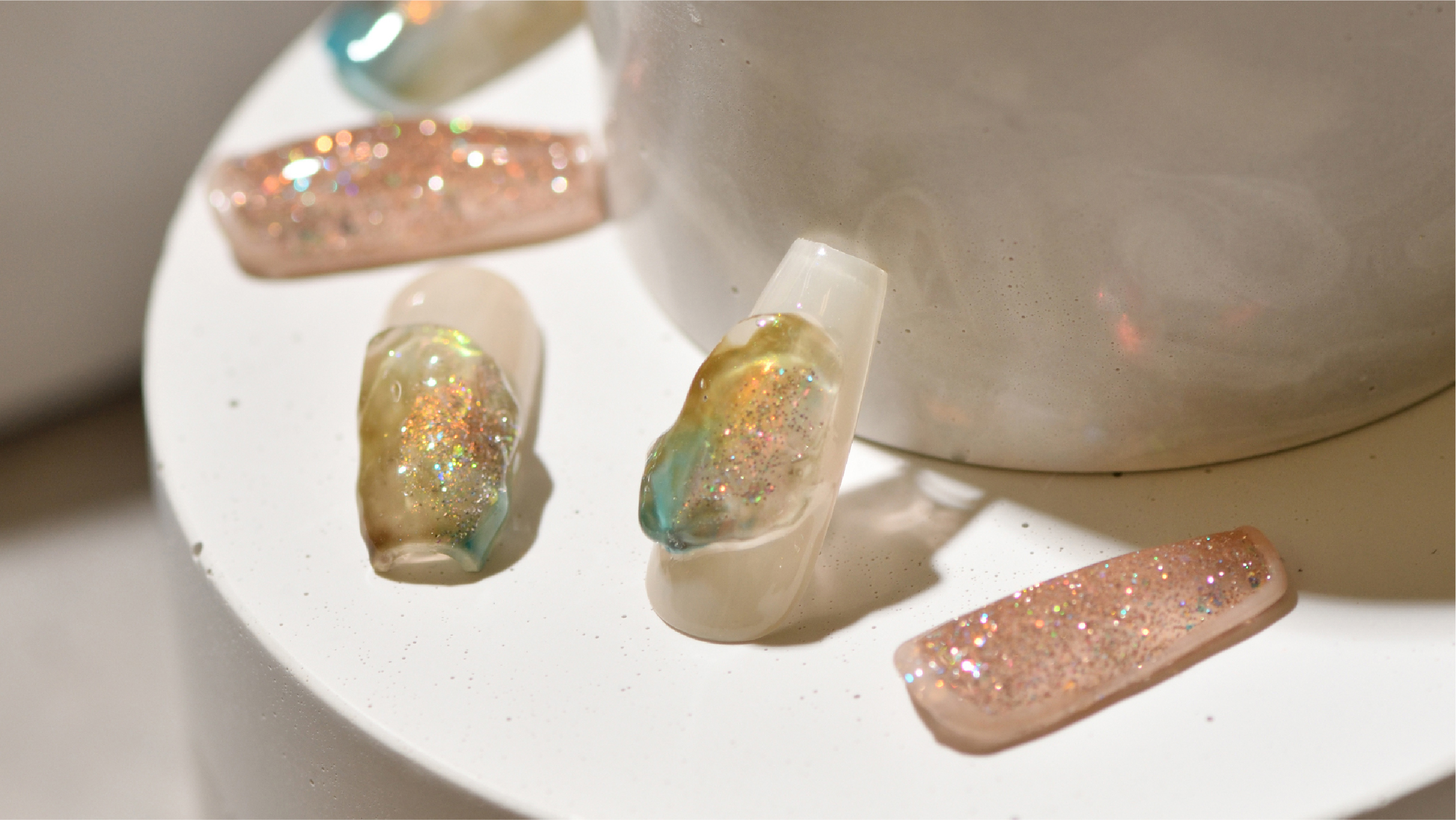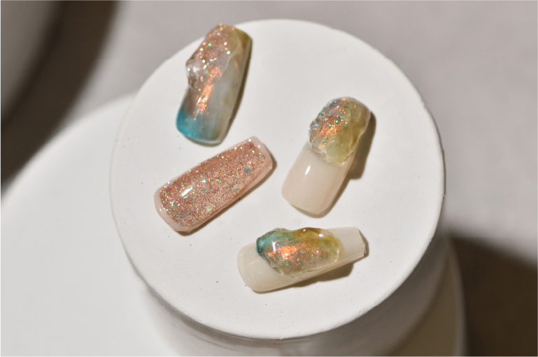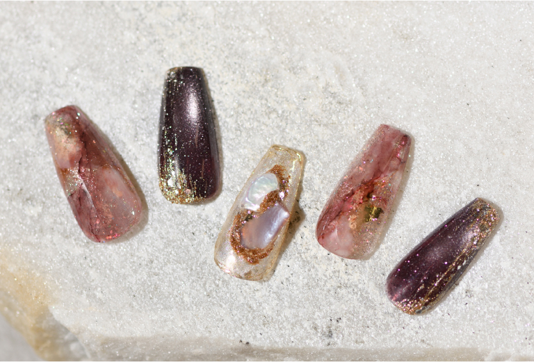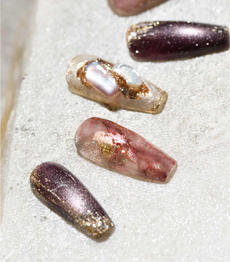 自然が作り上げた美しい鉱物を彷彿とさせる「鉱物ニュアンス」は、創造的なデザインを楽しめる人気モチーフ。ニュアンスを重ねた立体感のあるアートは、アクセサリーを纏うように爪先に上品な彩りを与えてくれます。