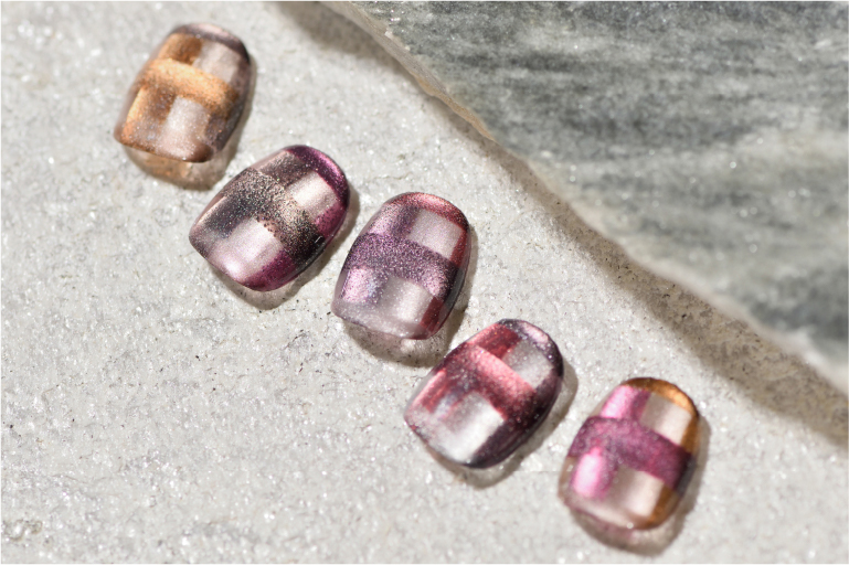 チェック柄と言えば秋冬のイメージ。この季節のファッションに馴染みやすいように、落ち着いたカラーをチョイスしました。また秋冬は、コーディネートのトーンが暗くなりがちなので、ネイルデザインではチェック柄の縦横の色味の明暗をはっきりさせる事で、手元が重くなりすぎないように意識しました。