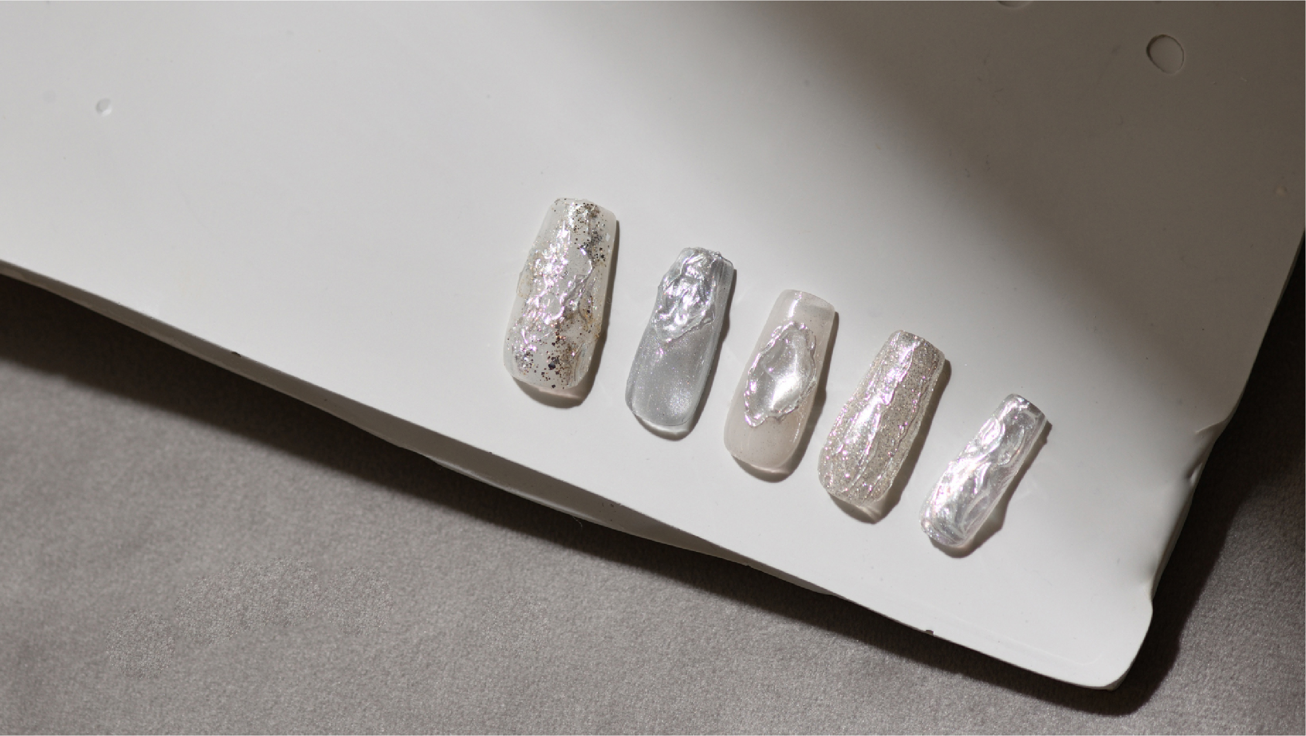 ややグレーがかった白っぽいシルバーのミラーパウダーに合わせて、ホワイトとシルバーのジェルやパウダーをセレクトし、トーンに統一感を持たせたデザインに仕上げました。 ミラーパウダーの色味を魅せる装飾にしたかったので、5本各々で異なる個性のミラー×シアーのアートを施しています。