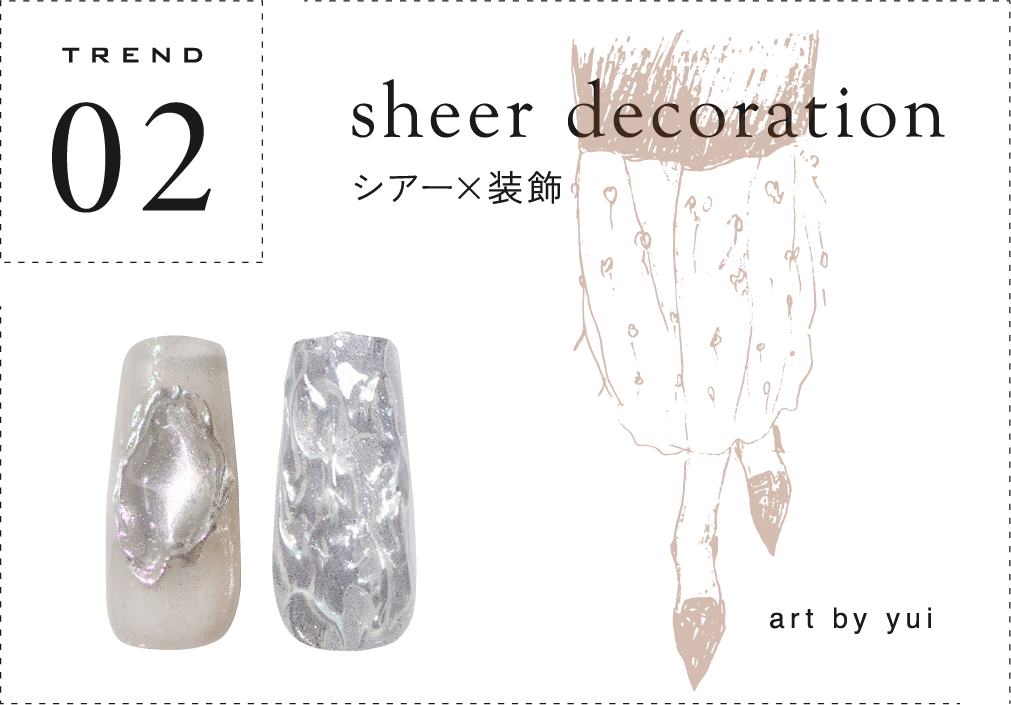 今秋はシアーの軽い素材感にきらびやかな装飾を施したモダンなデザインがトレンド。デコラティブなファッションがピックアップされる中、ネイルも透け感あるベースの中にキラキラとした装飾が舞う、奥行きのあるアートが旬!
