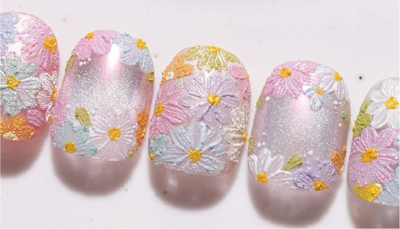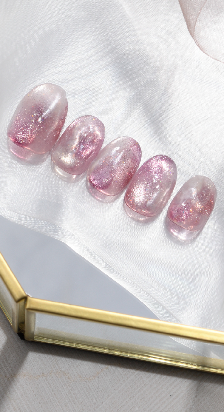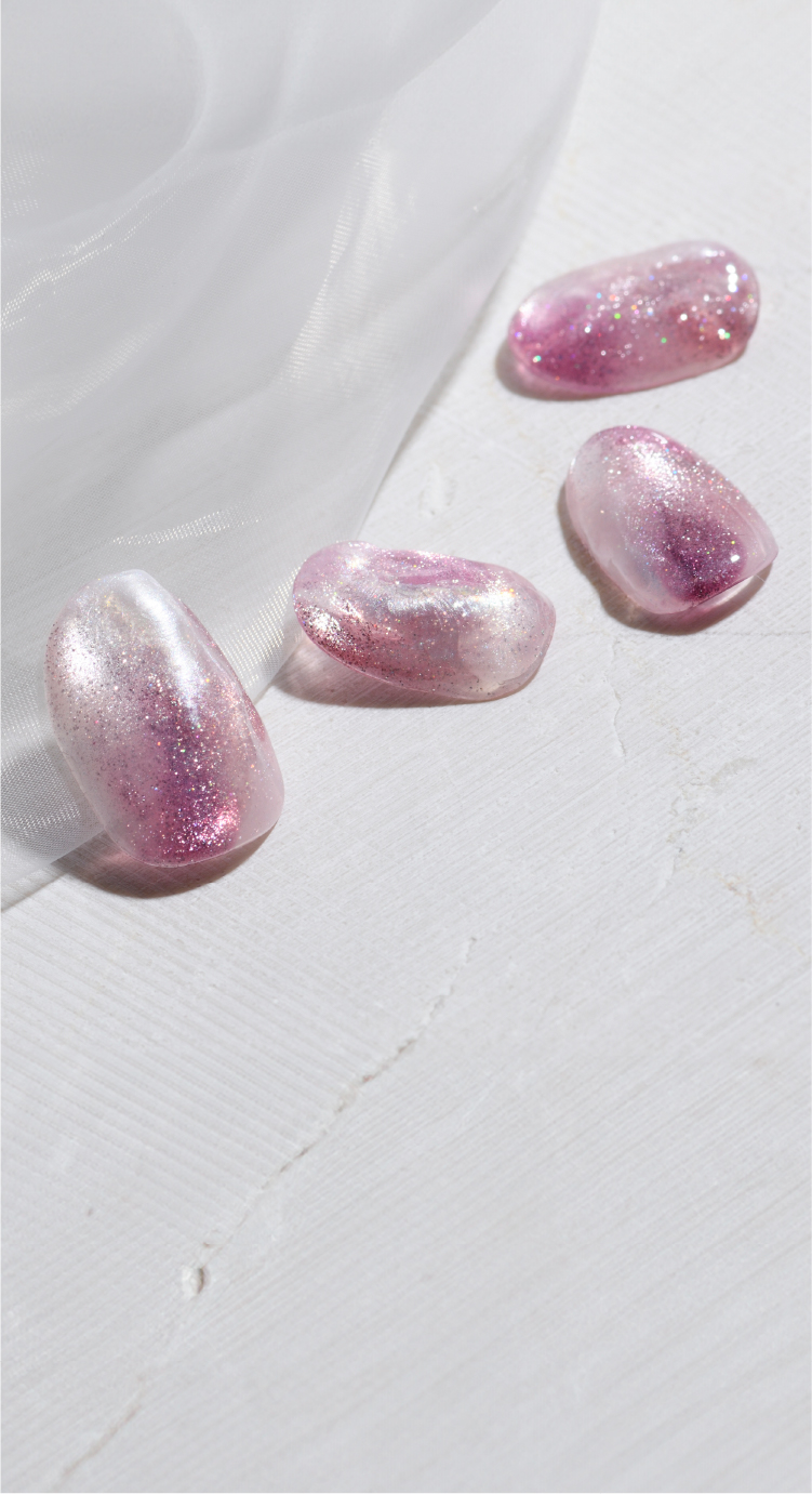 花びらのようなピンクと春のキラキラとした光の雰囲気を閉じ込めた、柔らかで多幸感溢れるイメージのアートを制作しました。微粒子のオーロラが入ったシアーカラーやホワイトパールをさりげなくプラスして上品さも。