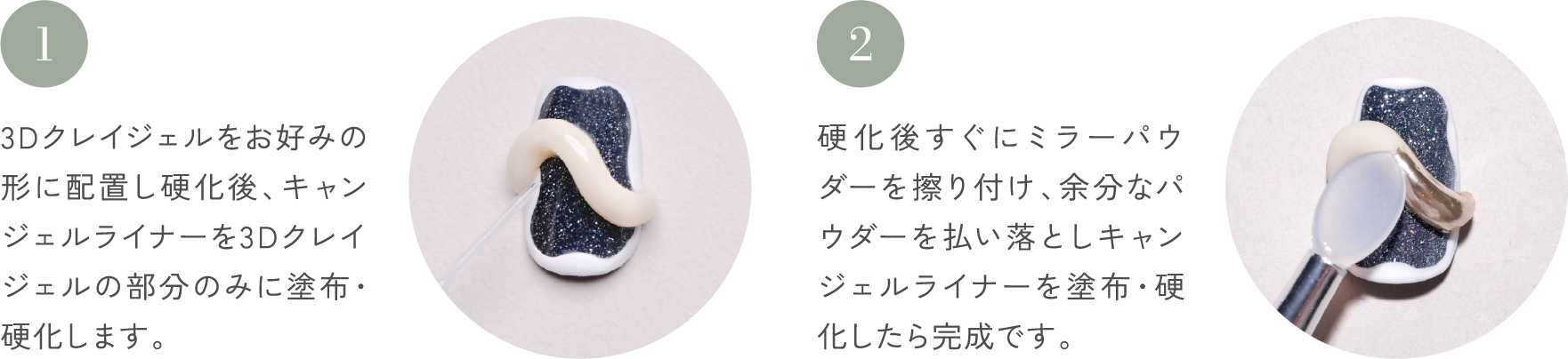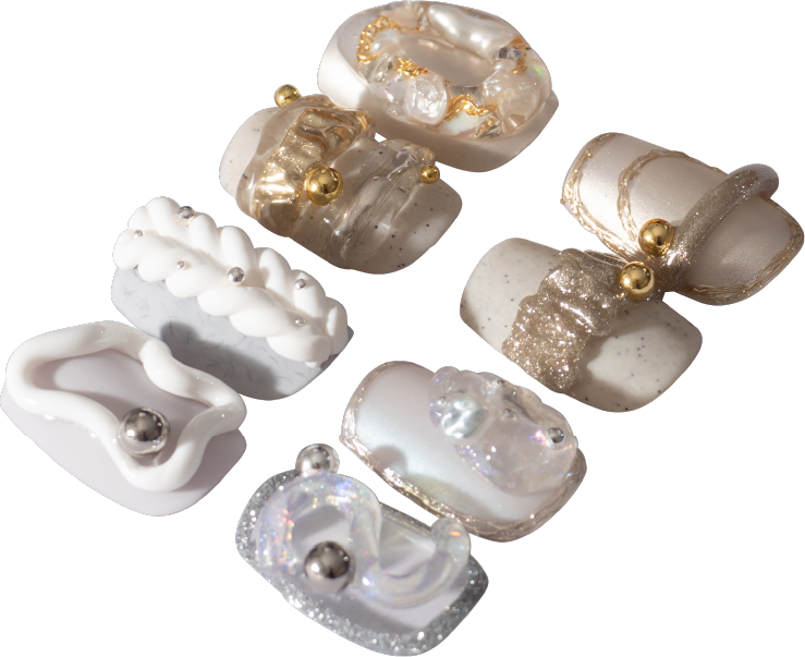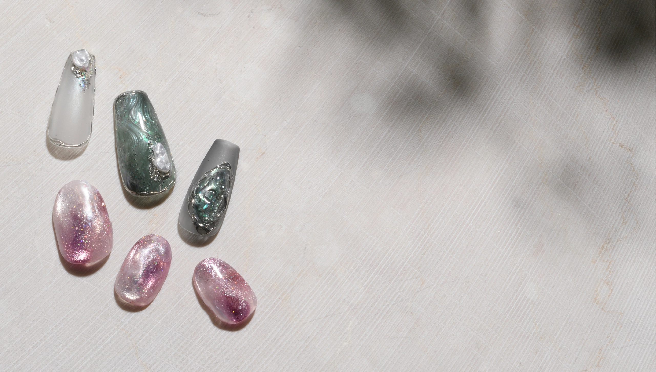 レベリングしないテクスチャーを活かして、ベースに細かなウェーブアートを。10秒硬化でミラーパウダーと組み合わせ、メタリックの囲みラインやパールパーツもジェルで再現しました。