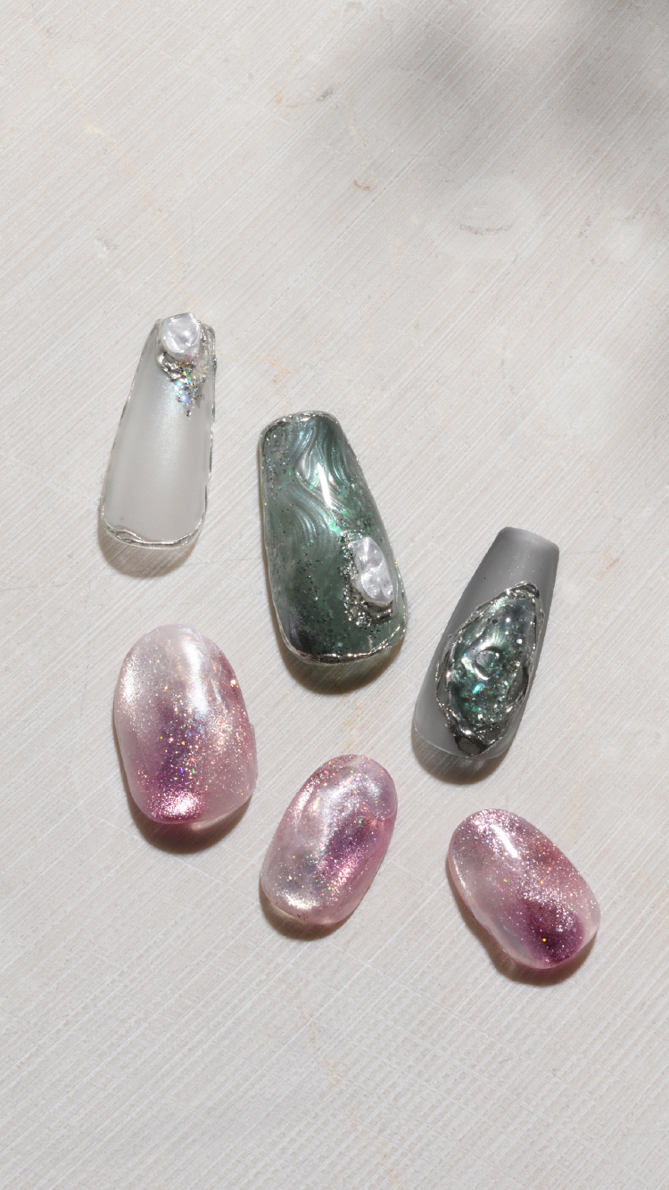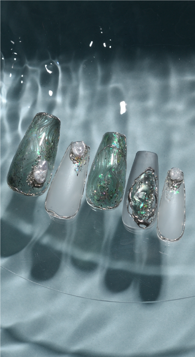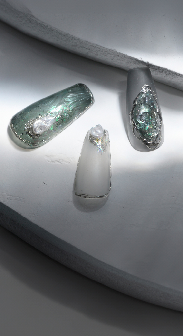 全体的にブルー、グリーン、グレートーンでまとめ、春夏らしい透明感を活かしたアートに。シルバーを組み合わせる事で軽く華やかな印象にし、流れるようなウェービングアートで動きをプラスしています。