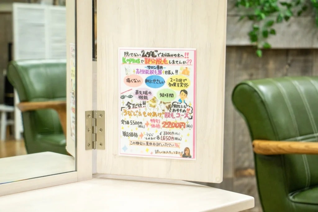水上さん:男性だったら「ヒゲそり、面倒くさくないですか?うち(脱毛)やりだしたんですよ」とかですかね。元々興味のある方は脱毛のことも調べていらっしゃるので、『この近くにお店がない』『金額が高くてローンを組まされる』『ローンを組んだのはいいけれど、予約したい時に予約が取れない』と色々出てきて、うちの説明をすると「やるやる!」と。距離感近く信頼関係ができているお客様が多いので、気軽にお声掛けしています。