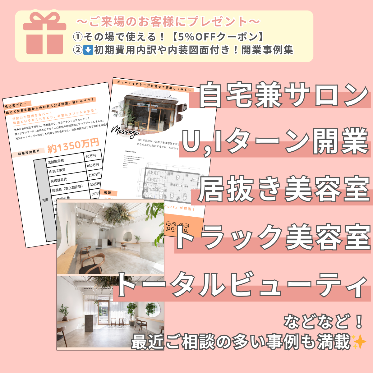 ②来場プレゼント!初期費用内訳や内装図面付き開業事例集