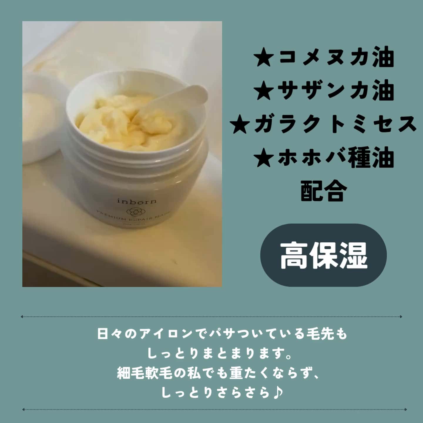 カラーやアイロンで硬くなった髪、パサつきが気になるお客様にぜひ提案したいのが、このinbornシリーズ 「プレミアムリペアマスク」です。